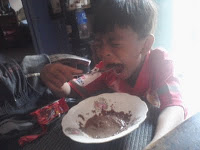 Entah anak’nya yang memang kreatif atau gimana. Dia mengambil satu buah piring dan air satu botol kecil. Kemudian 3 bungkus Biskuat di buka dan di taruh di piring. Kemudian di tuangi air secukup’nya. lalu, di hancur’kan keping Biskuat hingga menjadi halus dan kental. Lalu, di aduk-aduk rata hingga tercamput semua. Dan jadi’lah, Sereal Biskuat, murah bahan’nya, gampang buat’nya dan tentu enak rasa’nya.