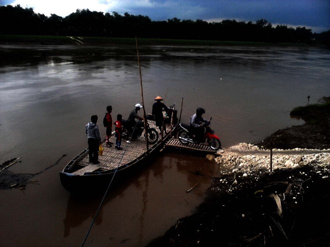 Saat perahu siap, motor jangan dihentakkan macam di Lamer loh ya.hehehehe,,, slow aja. Pelan-pelan. Jalan dengan hati-hati kaki di kanan kiri untuk menjaga keseimbangan, pas roda depan telah berpijak di samping perahu, cepatlah maju kedepan tapi jangan terlalu agresif. Siapkan rem depan, saat separuh badan naik injak rem depan lalu gas pelan-pelan hingga sempurna. Kaki tetap berpijak loh ya….. Jangan ceroboh,kang. Soalnya di depan anda setelah perahu adalah sungai yang kadang dalam loh.