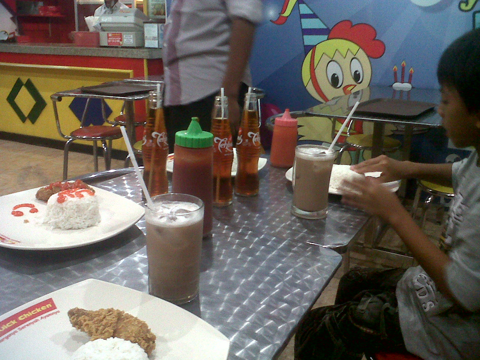 Semuanya pesan Ayam Paha dan minumannya Milo, Teh, dkk. Setelah menunggu lama, akhirnya datang juga pesanannya. Tapi, kok adem. Nah loh, dingin-dingin malam makan dingin. Haduuh,,, buruk deh.