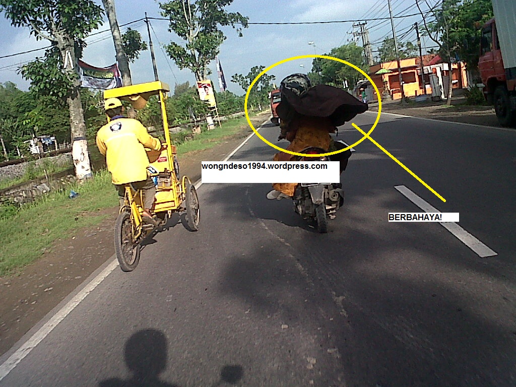 Apakah yang berbahaya dari gambar di atas? Anda perhatikan kerudung yang semburat itu. Kalo umpama papasan ma truk terus nyangkut gimana? 😦 Kalo masang kerudung mending yang aman atau diiket ke depan dan kerudungnya jangan sampai terbang gitu, bahaya. Kayak jas hujan batman dan jaket di balik.IMG-20140109-00890s
