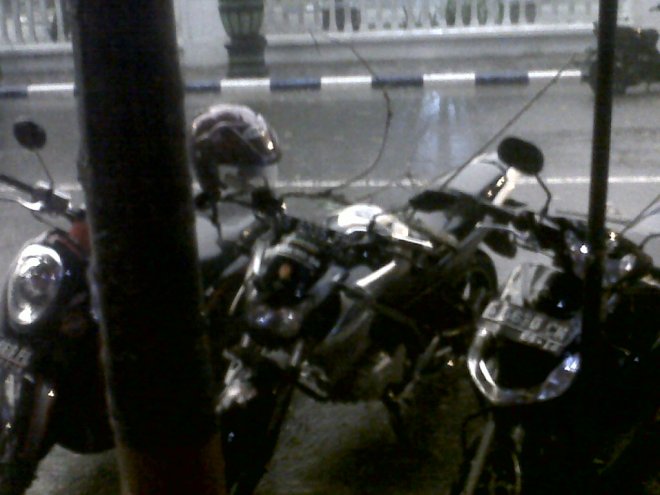 Akibat angin yang kencang pula, si Gold yang udah kena hujan lebat malah ketiban ranting pohon yang besar. Apesnya yak. Untung saja tak mengenai headlamp atau tangki, bisa-bisa pecah. Ranting besar itu jatuh tepat di jok dan mengenai Scoopy FI milik temen.