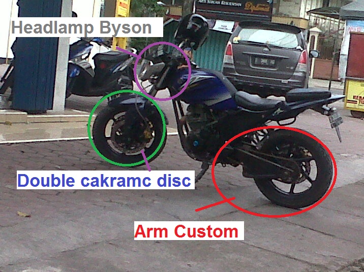 Ane mendapatkan spyshoot modifikasi dari Yamaha Scorpio z, di samping warung Cakno Banjarrejo. Gambungan dari dobulke disc brake, arm custom, headlam byson. Street Fighter wannabe ini.