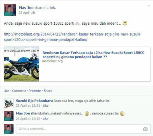 Berawal dari membaca postingan mas joe yang di sini. Di kabarkan bahwa motor sport 150cc Suzuki akan muncul akhir tahun ini. Ya harusnya sih begitu, kalau bisa tengah tahun (ngarep.com). Kan nanti jadi lebih seru persaingannya.