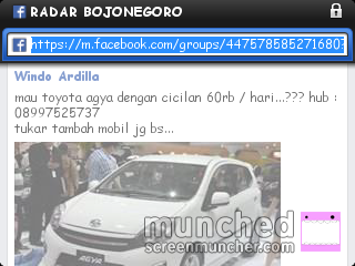 Sebuah postingan di salah satu group facebook lokal yaitu Radar Bojonegoro, menampilkan sebuah promosi angsuran mobil Toyota oleh salah satu user fb.