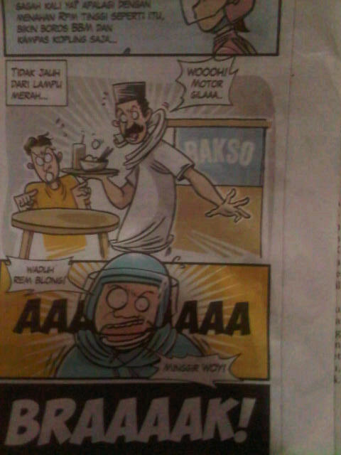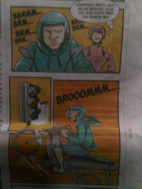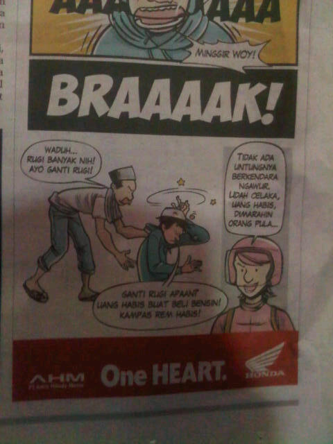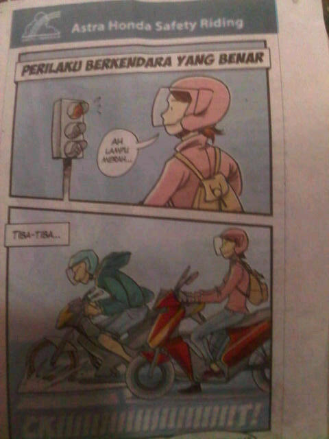 Ada yang baca koran edisi kemarin? Minggu tanggal 26 Oktober. Nah, di koran terbesar se Indonesia yaitu Jawa Pos ada kartun dari Astra Honda yang bertajuk safety riding. Kali ini, edisi yang menyinggung alayer lampu merah.