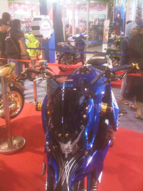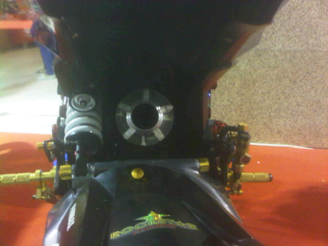Modifikasi yang mengarah ke street fighter ini bener-bener ekstrim. Ubahan-ubahannya sudah tidak menunjukkan ini motor cc kecil. Bener-bener gambot. Aplikasi ban belakang dan arm seukuran moge. Shock depan yang unik, klassik sepertinya custom nih. Tapi sayang kurang fungsional juga.
