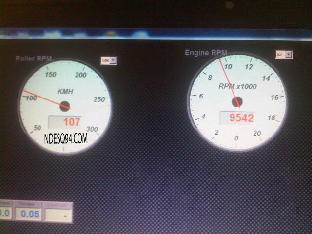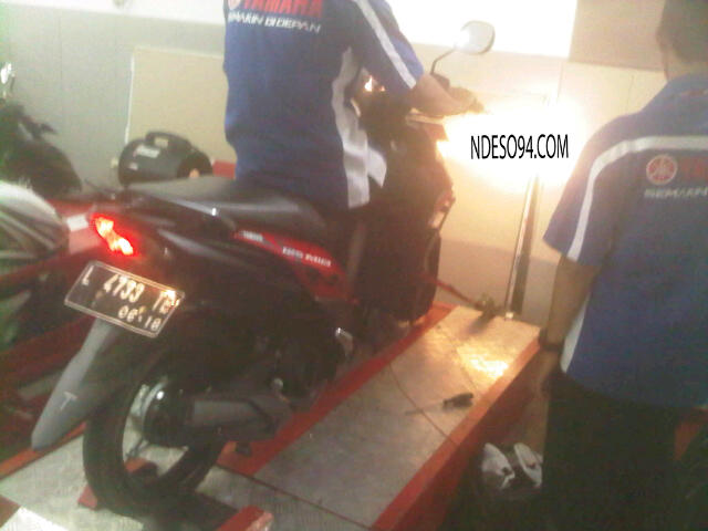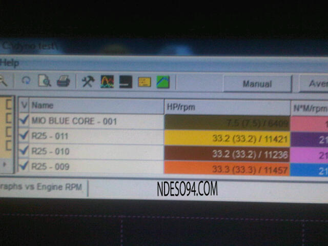 Tenaga yang di hasilkan Mio M3 ini, maks 8HP dengan rata-rata 7,5HP@6.709rpm dalam kondisi mesin sudah suhu panas. Kecepatan maksimal 110km/jam on dyno dengan rata-rata 107km/jam dalam kondisi mesin sudah suhu panas. Lumayan juga nih, sepadan ama Mio karbu. Gambar di bawah adalah saat posisi mesin manas. Dengan asumsi on Dyno. Pas dapat 8HP dan 110km/jam’nya gak kepotret, lupa