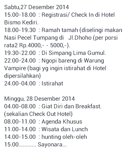Berikut sedikit gambaran rundown acara Tasyakuran 3thn Jatimotoblog yang akan dilaksanakan di Kota Kediri nanti 27-28 Desember 2014.