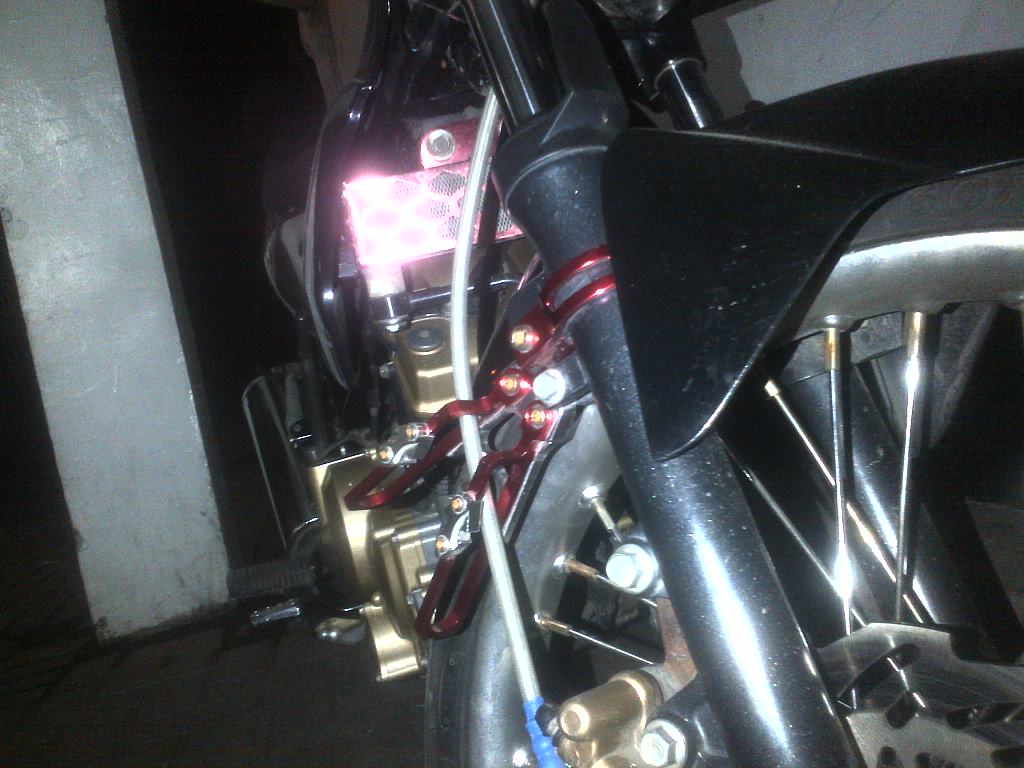 Teman sekerja ane lagi memproses modifikasi motornya gan. Dengan memakai body kit variasi Satria FU berbahan ABS, body kit itu dipotong di beberapa sisi sesuai selera yang diinginkan temen ane. Rencananya bikin shroud samping dan cover engine kecil di bawah, mirip CB150R gitu.Untuk body depan udah dipotong sisi tengah. Tinggal pasang hasil potongan sisi bawah, yang memerlukan dudukan tambahan agar bisa nempel di baut-baut mesin. Katanya bingung mau bikin di mana, di bengkel las takut salah (baca : gak bisa masang sendiri 😀 ).