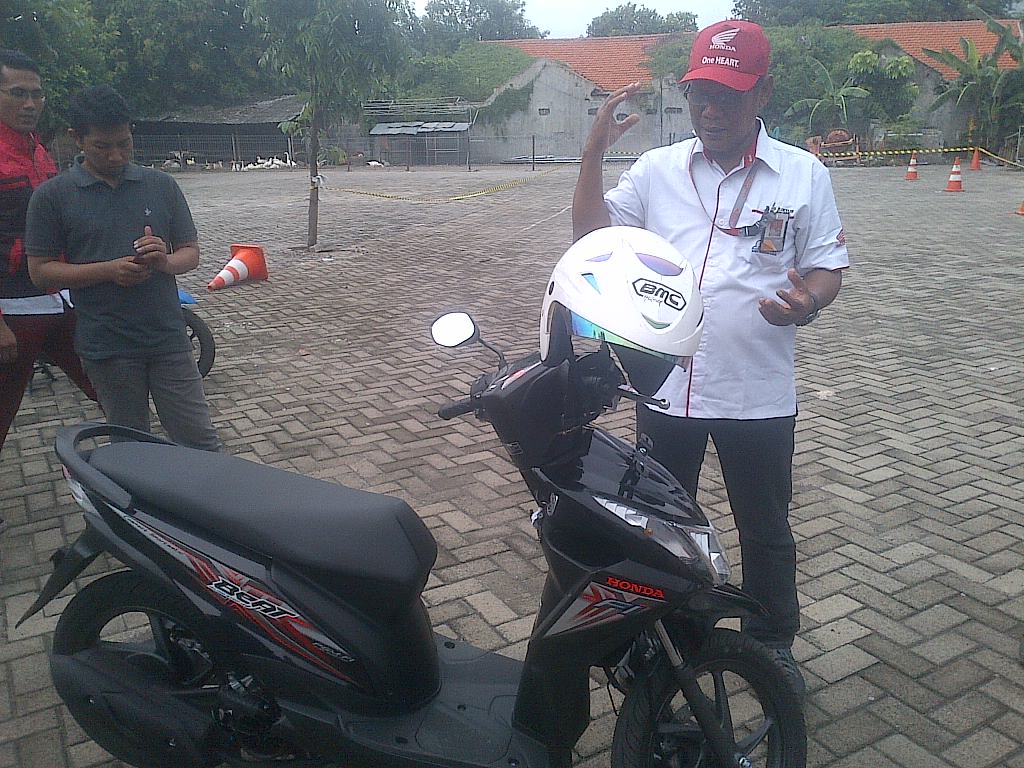 Tak cuma test ride aja. Namun, ada sedikit materi tentang safety riding yaitu pengereman yang benar dan tentu safety gear yang benar itu gimana. Lumayan dapat ilmu. Tanks pak.
