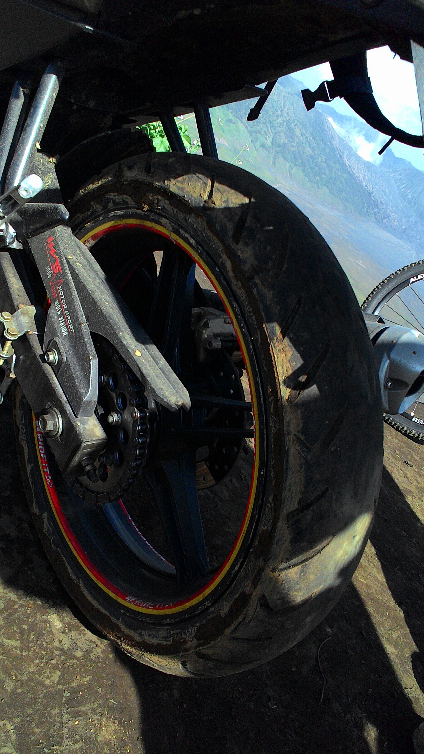 Mereka yang balik kanan sepertinya takut akan resiko besar terutama CBR150R yang juga balik kanan(istilah batal muncak). Dan benar saja, kami di sambut jalan rusak berbatu dan licin. Pemanasan nih…. walau cuma batu licin yang kang tyo mudah melaluinya dengan KLX. Kami yang pakai motor biasa habitat aspal. Si Gold sendiri pakai ban belakang slick alias aus