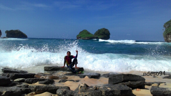 Pantainya sepi, mungkin karena hari senin. View yang diberikan amat indah. Ombak yang besar khas pantai Selatan dan beberapa pulau kecil yang terlihat indah dan Subbhanallah. Bro ndess juga sempat mencari foto sengan view terbaik di sini 😀