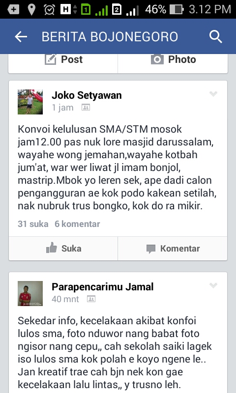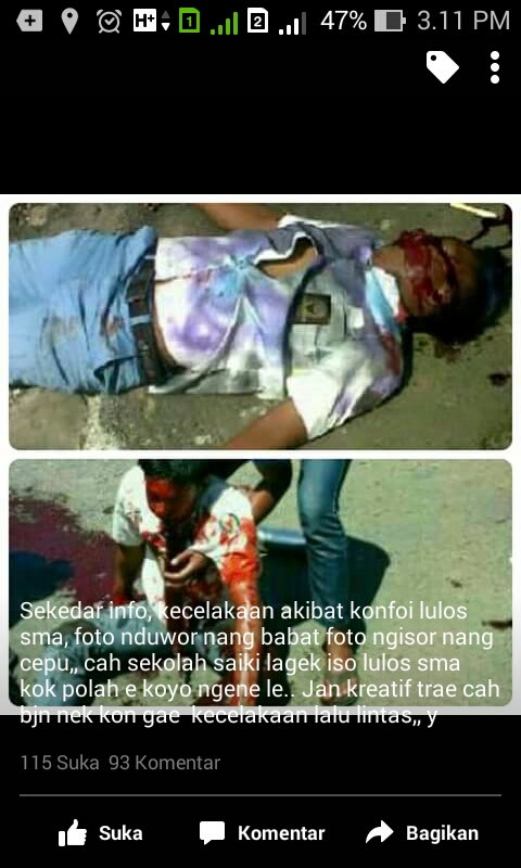 Sekedar info juga, terjadi kecelakaan maut yang berlokasi di Cepu dan Babat. Dua kecelakaan dengan korban anak SMA/K yang konvoi. Tanpa memakai perlengkapan berkendara yang safety. Minimal helm. Jangankan helm, spion aja gak pakai. Otak juga gak dipakai.