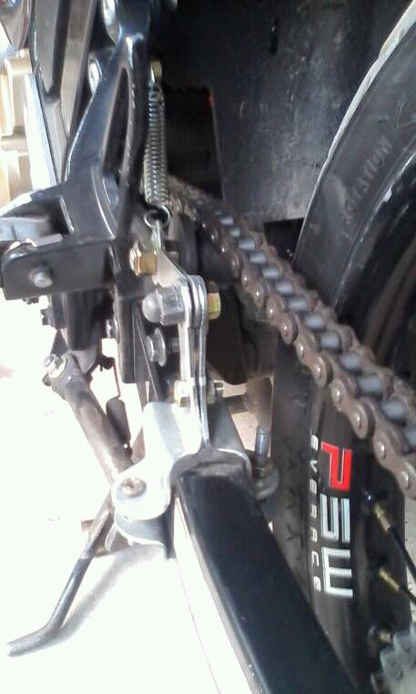 Yups, tensioner murah itu pernya tidak disambungkan ke siku dan brakernya. Melainkan ke dudukan footstep belakang sehinggaa terlihat menggantung. Kreatif juga nih. Kan umumnya di taruh di bawah.