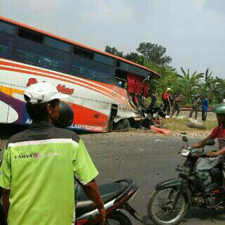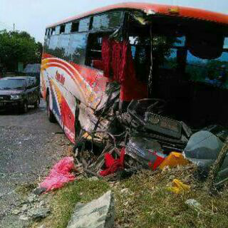 Brosis, terjadi kecelakaan tadi siang du Bojonegoro. Melibatkan Bus dengan Truk Tangki. Tidak tahu ada korban atau tidak, kalau melihat keadaan bus sih ada. Terlihat sisi depan bus hancur.
