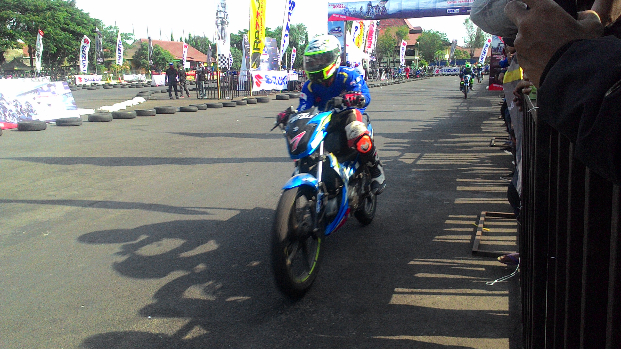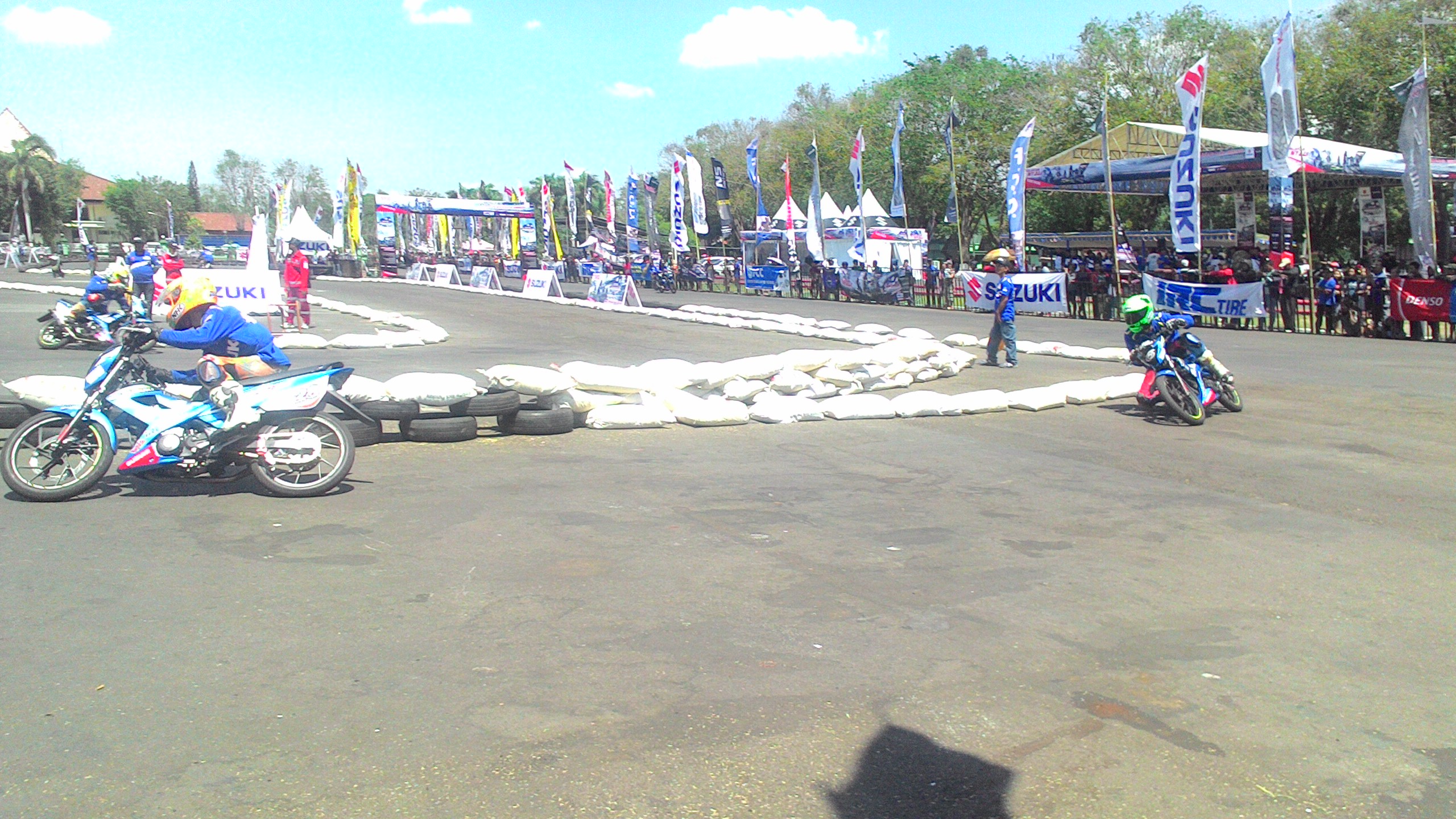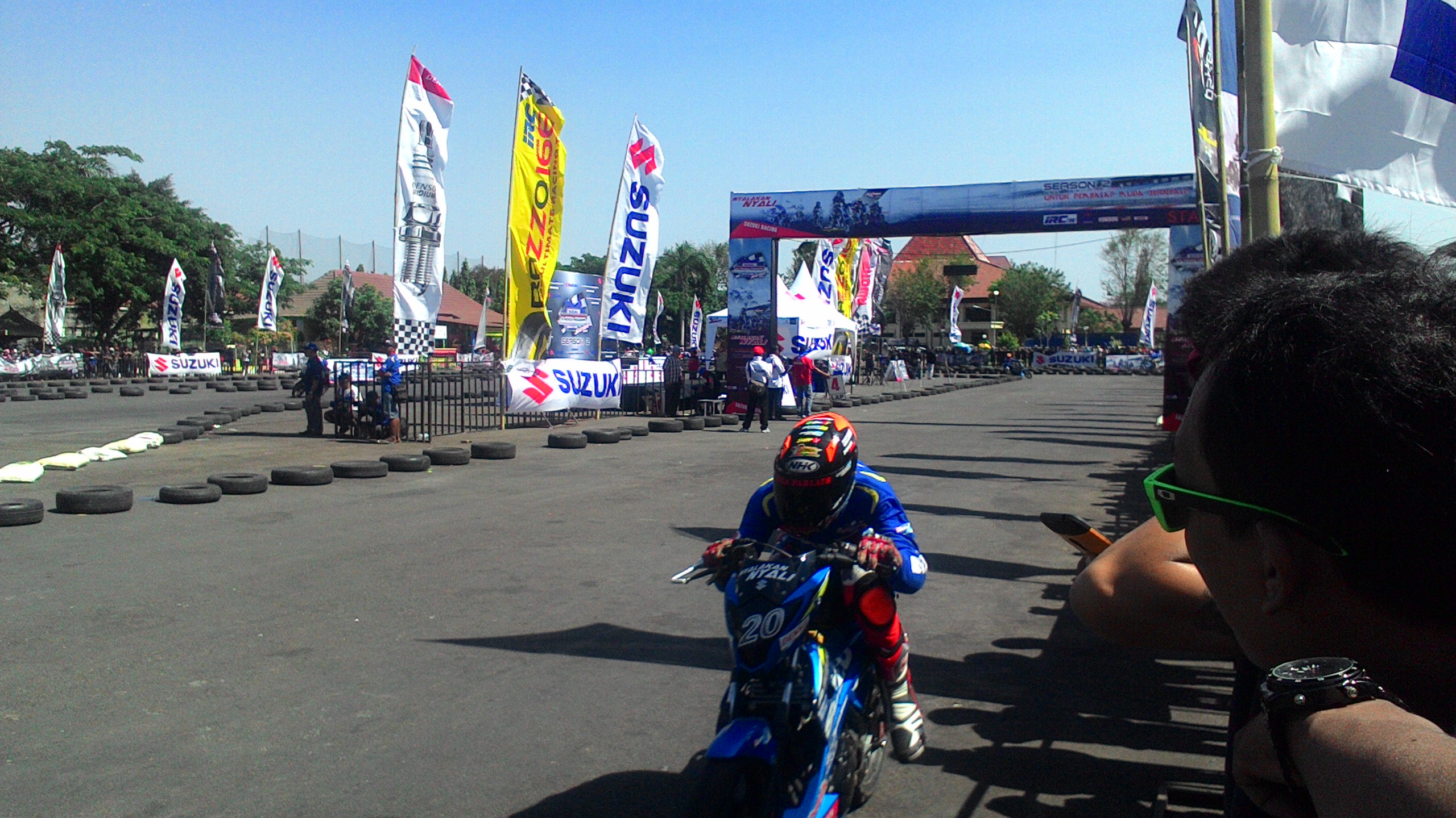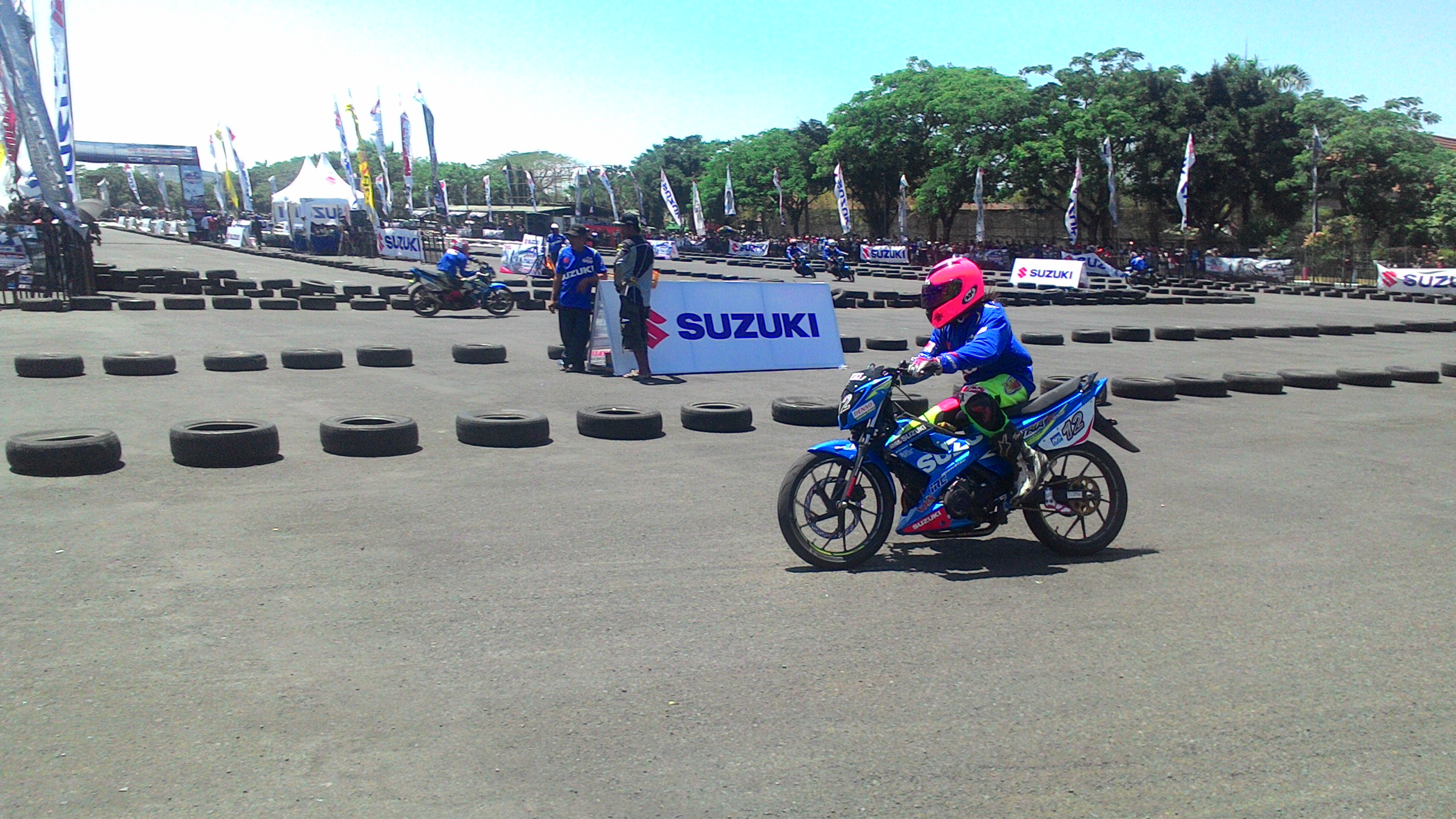 Event ini diikuti pembalap-pembalap pemula dari seluruh Jawa Timur. Usianyapun muda-muda. Mulai dari 13tahun. Oh iya, motor sudah disediakan panitia dengan setingan sederhana, cukuplah buat digeber semial ban, knalpot, gear set, footstep, CDI/ECU, dan aki. Suzuki juga mengundang klub-klub motor Suzuki di Surabaya untuk menghadiri event ini. Ada acara khusus penonton yaitu Event Suzuki Ghymkhana yang berada di pojok event. Memakai Suzuki Adress, peserta dituntut menyelesaikan dengan sempurna dan waktu tercepat di lintasan yang sudah disediakan. Bro ndes kalah di event ini 😦