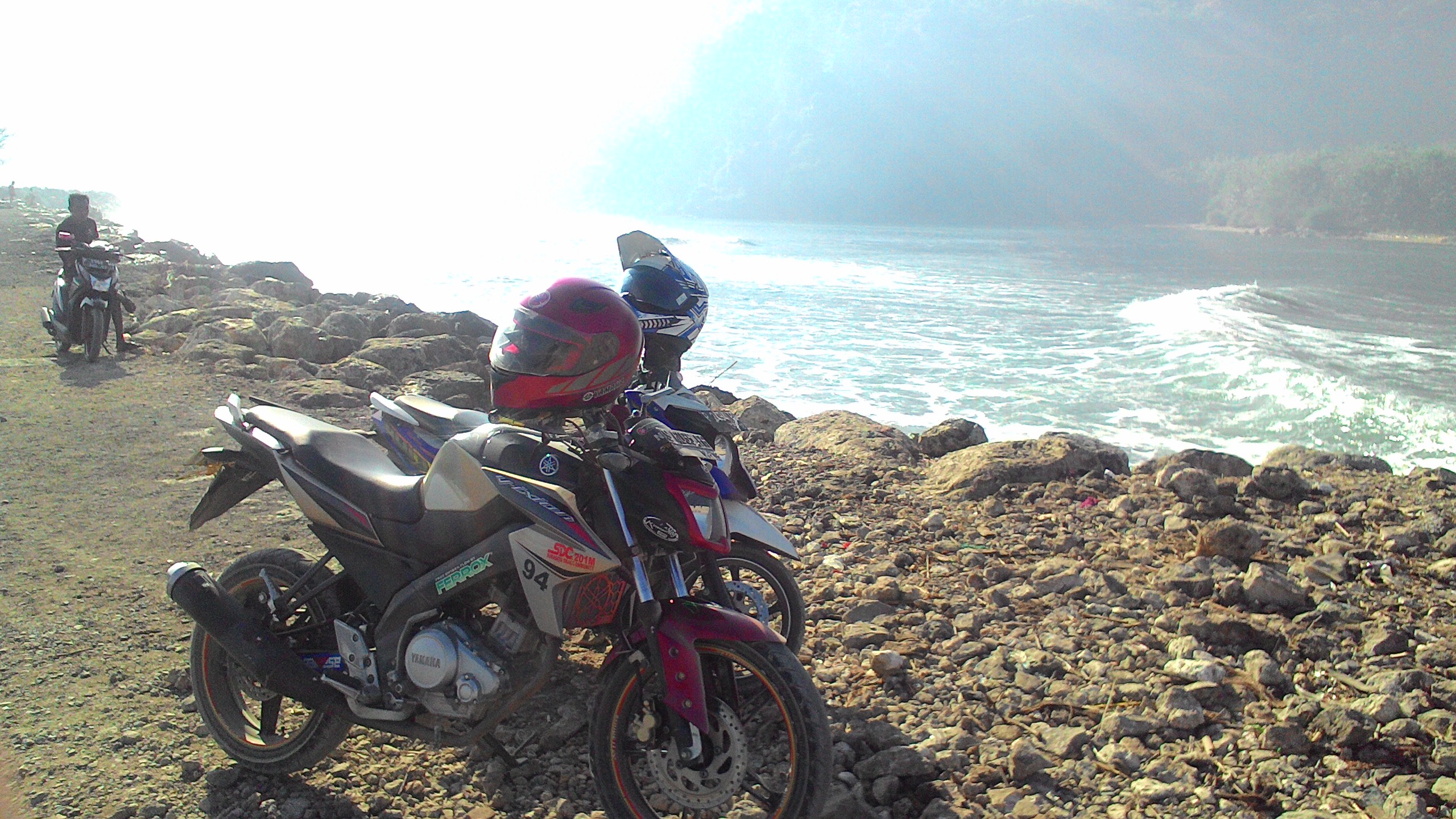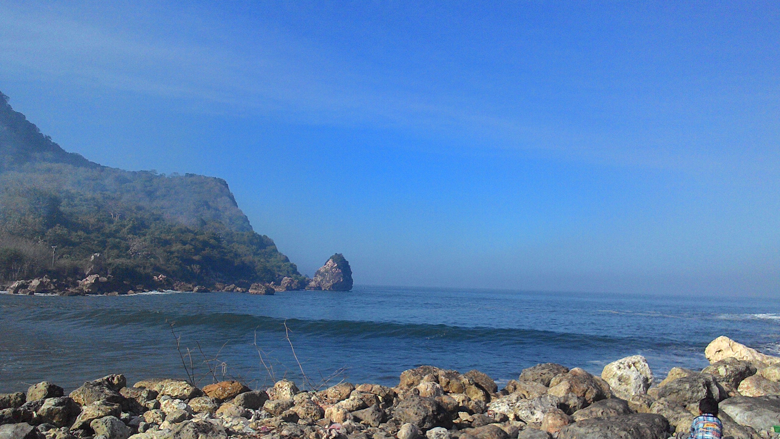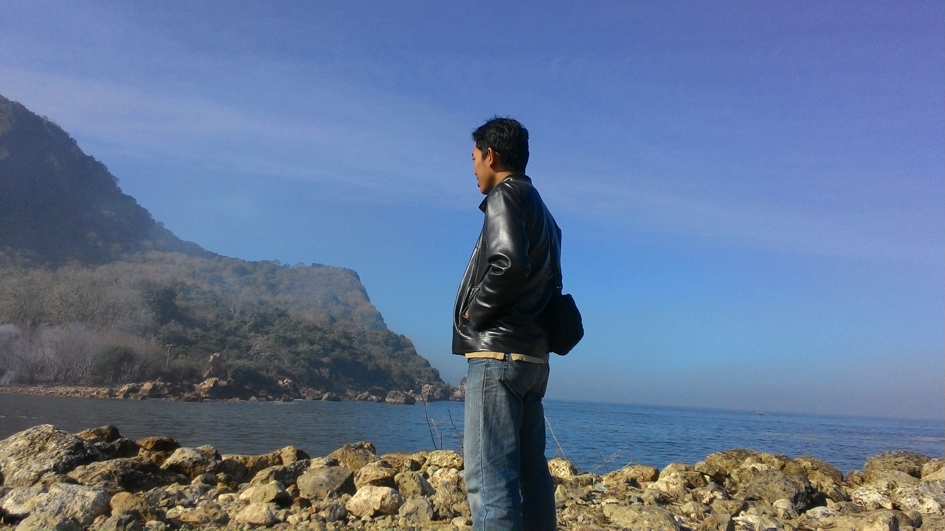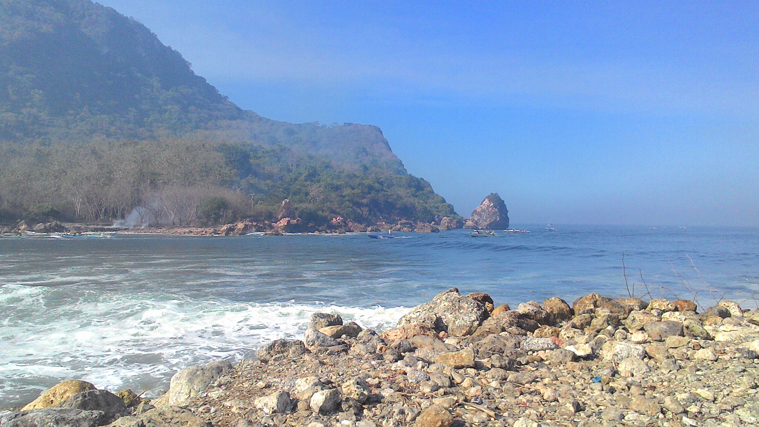 Oh iya brosis, Pantai ini punya background yang bagus. Yaitu dengan bukit yang berada di seberang teluk cocok buat fotografi. Bukitnya juga masih lumayan hijau, bukit itu sepertinya berasal dari patahan lempeng karena terlihat tebing terjal yang tinggi.