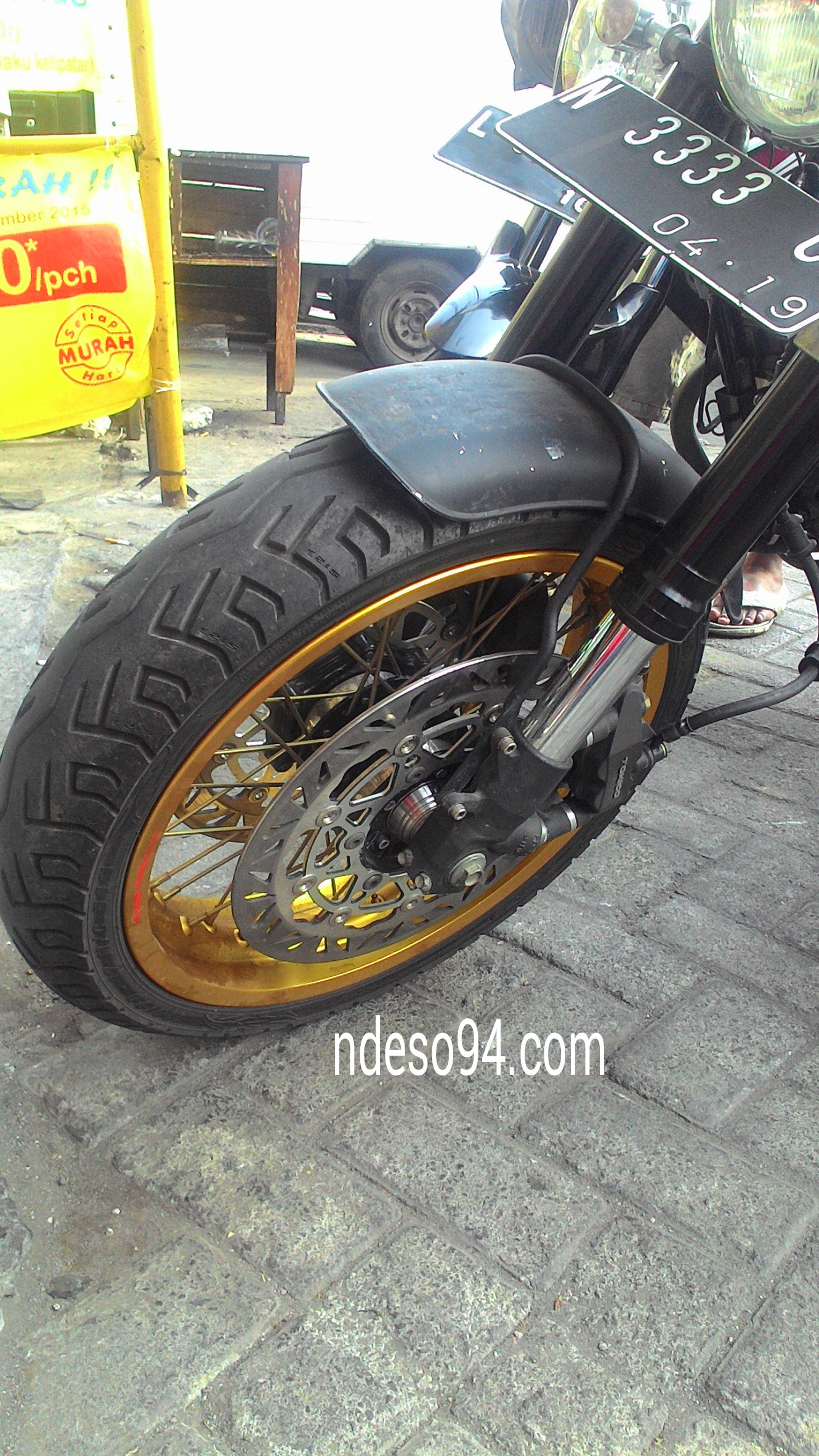 Shockbreker asli diganti satu set up side doen (USD) shock! Di tambah double disc brake serta ban yang gambot lebar membuat motor ini jadi lebih gambot. Jelas kalau beli part baru itu habis 3juta lebih buat kaki-kaki aja.