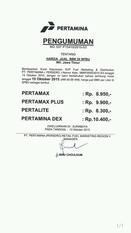 Brosis, mendapatkan kiriman dari teman tentang info harga bbm turun. Kini harga bbm selain Pertamina Dex di bawah 10rb semua regional V.
