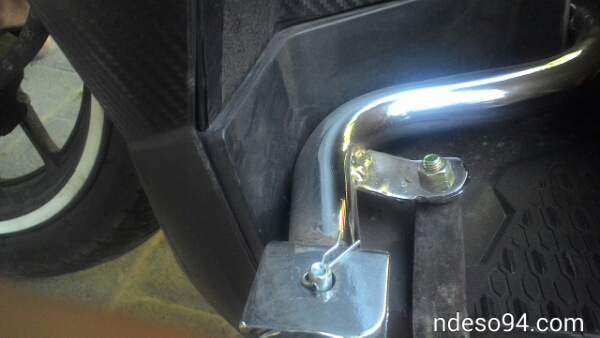 Lalu bagaimana caranya agar footstep ini bisa pasang di matic Honda yang aki bawah? Kasih braket brosis. Plat yang ditekuk lalu di baut di dek bawah samping. Contoh seperti gambar di bawah ini, ada pada VarTech 150 ESP.