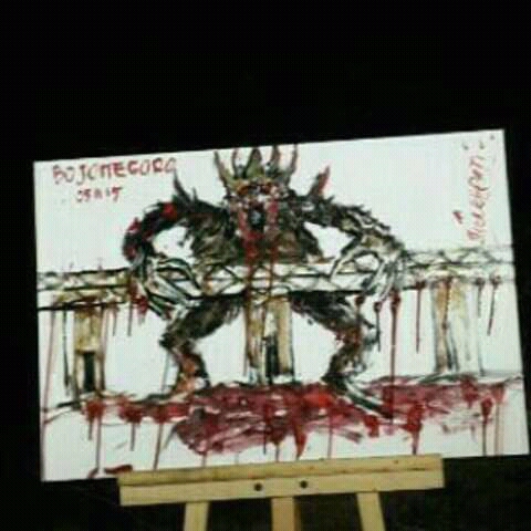 Ternyata ada sosok genderuwo yang menyeramkan berhasil dilukis crew “Mr Tukul” di sini. Bro sis mesti hati-hati, sosok yang dilukiskan seperti berada di samping pagar besi penuh darah. Mungkin itu wujud asli pemandangan di dunia gaib. Tidak secantik yang terlihat. Ini detailnya :