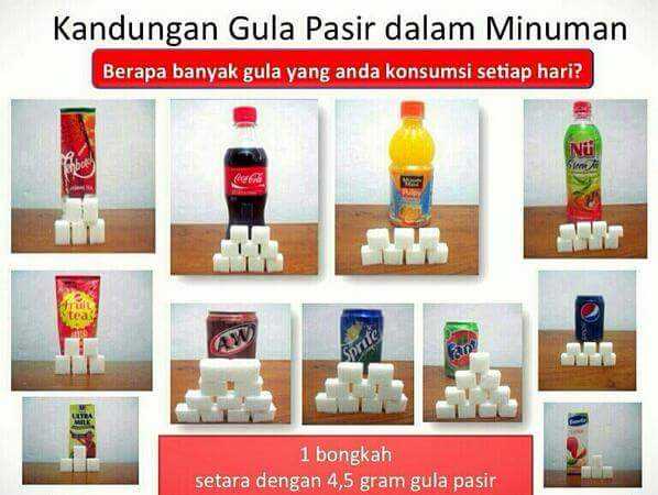 Bagi yang gemar minum minuman kemasan dan juga di restoran, ada baiknya juga mengetahui kadar gula yang ada pada minuman tersebut. Tentu berbahaya jika kebanyakan gula karena bisa beresiko penyakit seperti hipertensi, jantung, diabetes dan lain-lain. Berikut pembagian kadar gula pada masing minuman kemasan :
