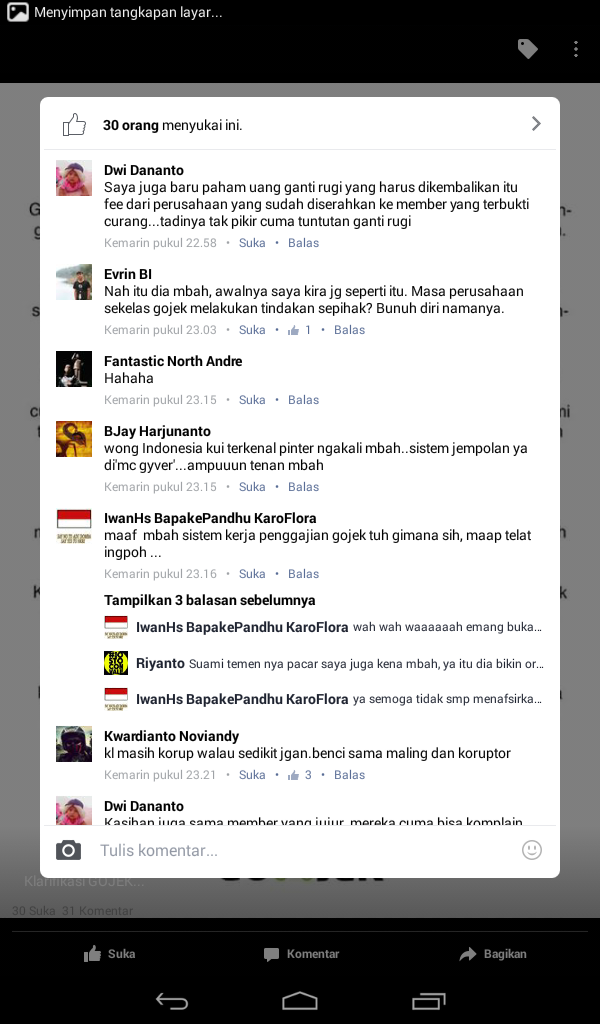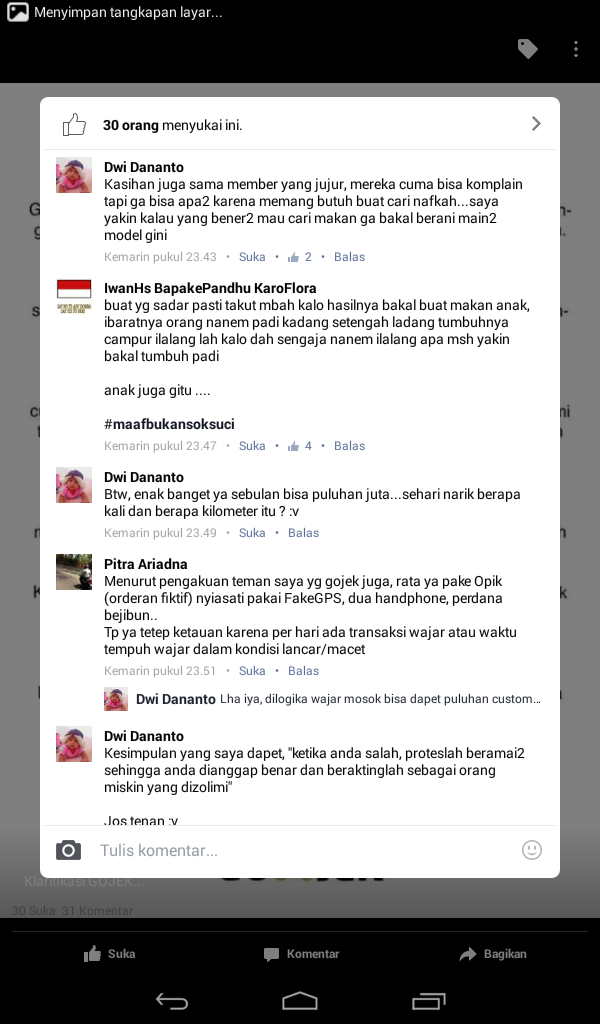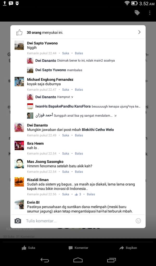 Satu membayar denda dan melanjutkan kemitraan, dua keluar dengan tidak hormat. Seperti penyataan resmi Gojek dalam facebook fanspage resminya. Lalu mengenai denda 92juta yang beredar di sosial media dan blogger, Gojek menyatakan hal itu adalah rekayasa alias Hoax. Nah?