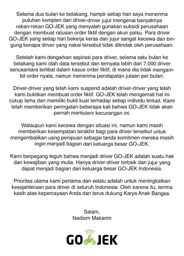 Ya bisa disimpulkan, akibat ketidakjujuran beberapa driver terkait order di mana order itu fiktif atau bikinan sendiri. Hal tersebut sudah diseldiki oleh manajemem Gojek.