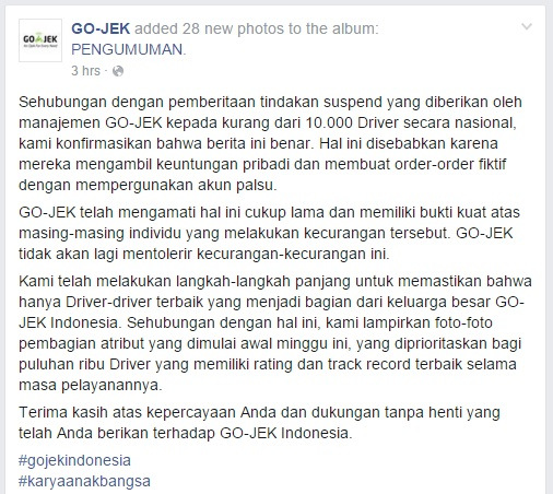 Terkait hal ini, Gojek sudah membentuk tim untuk standby di masing-masing kota untuk mengawasi dan memproses para driver yang bersedia mengikuti prosedur untuk mengaktifkan akun yang tersuspend. Woohh,,,
