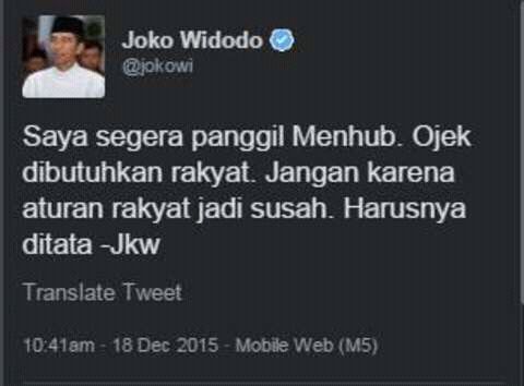 “Saya segera panggil Menhub. Ojek dibutuhkan rakyat. Jangan karena aturan rakyat jadi susah. Harusnya ditata,”