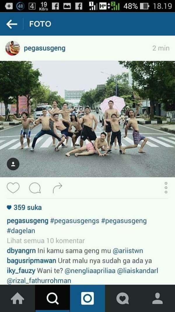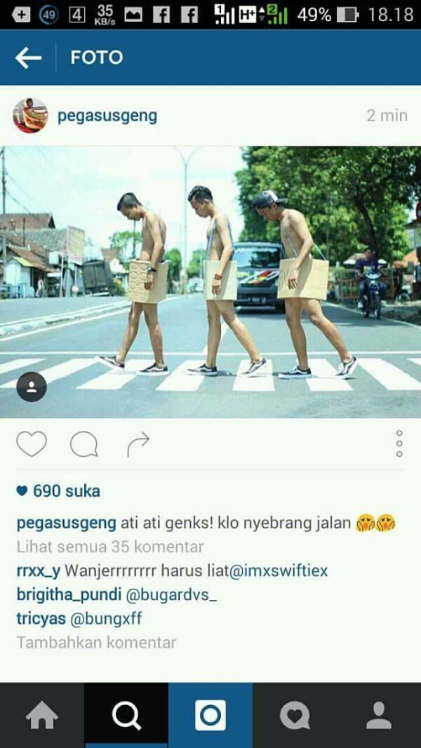 Adalah akun @pegasusgeng. Mengupload aksi narsi setengah telanjang, baju mandi bahkan handuk doang di Zebra Cross. Foto gaul tahun 2016 kah? Nih foto-fotonya :