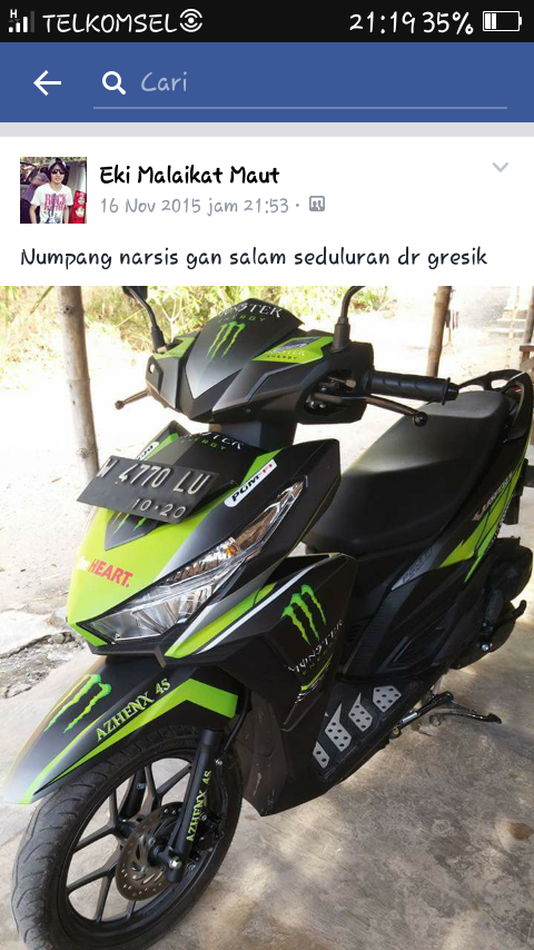 Motif Vario dari gresik ini adalah monster energi dengan ciri khas logo M dengan warna hijau doff. Mirip livery Yamaha Tech3 Team MotoGP saja. Hehehehe, buat inspirasi brosis yang pengen modifikasi Vario 150’nya.