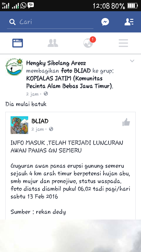 Dari info yang sudah ada, guguran awan panas erupsu Gunung Semeru mengarah 4km ke timur. Potensi hujan abu untuk daerah pronojuwo dan Smbj Mujur. Status Gunung Semeru Waspada. Foto diambil pukul 6 pagi tadi tanggal 13 Februari menurut BLIAD.