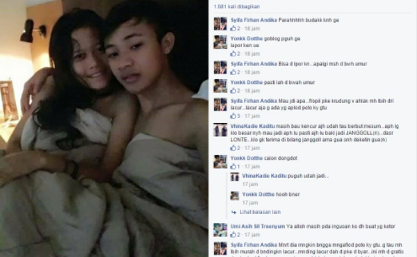 Bro ndess kasihan dengan orang tua terutama ayahnya. Anaknya jadi nakal gini. Kurangnya pengawasan pergaulan nih. Masih kecil juga sudah diperbolehkan pacaran. Harga diri si anak cewek sudah hilang. Kita tidak bisa selalu menyalahkan yang cowoknya. Karena kalau bukan karena paksaan atau sukarela, tak mungkin cowok bisa “mengagahi” si cewek. Foto bareng diupload di facebook lagi, waduh dek… bentar lagi masuk berita nih.