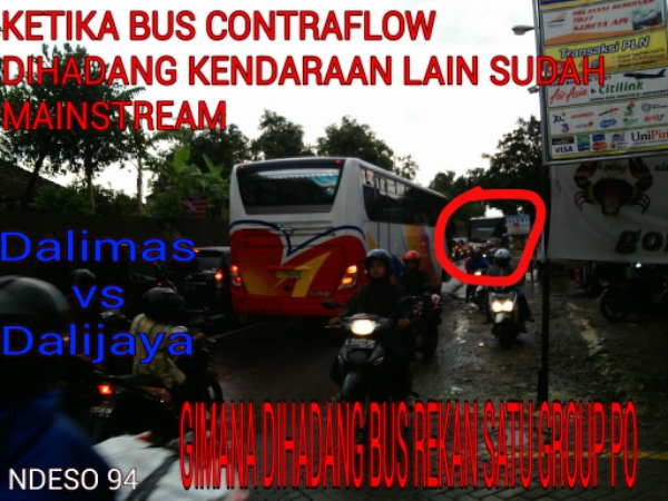 Sayang memang, kemarin sore kena apes. Salah satu bus yaitu Dalijaya kala nggak salah, melakukan contraflow melewati macet. Namun, arus yang padat dan kendaraan yang tak ada jarak membuat bus ini tetap melaju ke depan. Tak di sangka, dari depan ada bus Dalimas yang berada di jalur yang benar. Merasa berhadap jadapan, bus Dalimas berhenti. Bus Dalijaya maju terus mencari celah buat masuk ke jalur awal. Ndilalah enggak ketemu. Sampai akhirnya dua bus itu hadap hadapan.
