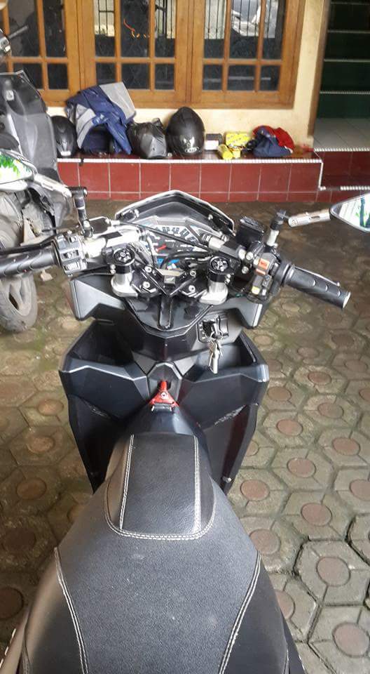 Soal pemilihan warna, bro Rizki ini mencustom agar mirip dengan Vario Techno Thailand atau lebih dikenal dengan Honda Click. Yaitu bagian plastik body hitam, pada sisi dek. Diberk warna merah. Kalau versi Indonesia kan, carbon look. Tapi warna Vario Techno terbaru sudah mirip dengan versi Click Thailand.