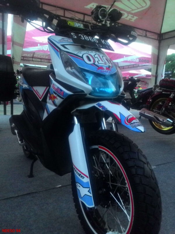 Sidebox ukuran 21L, stang model trondol dengan stang lebar. Handguard besi. Body motor dilabur stiker dengan grafis kerem, CVT juga. Aplikasi velg jati jari dan ban tahu menegaskan ini motor siap diajak ke rute jalan rusak makadam. Motor yang jadi jagoan BeAt Lamongan Community di HMC Tuban ini juara 1.
