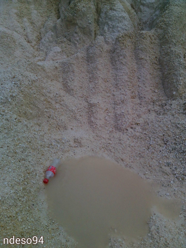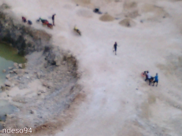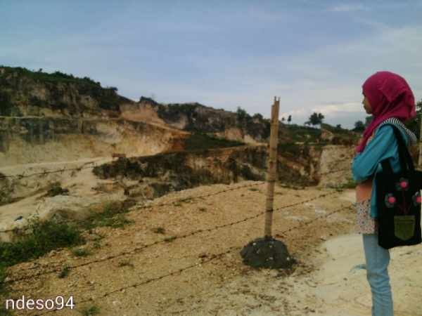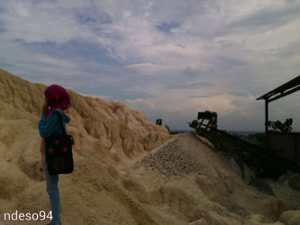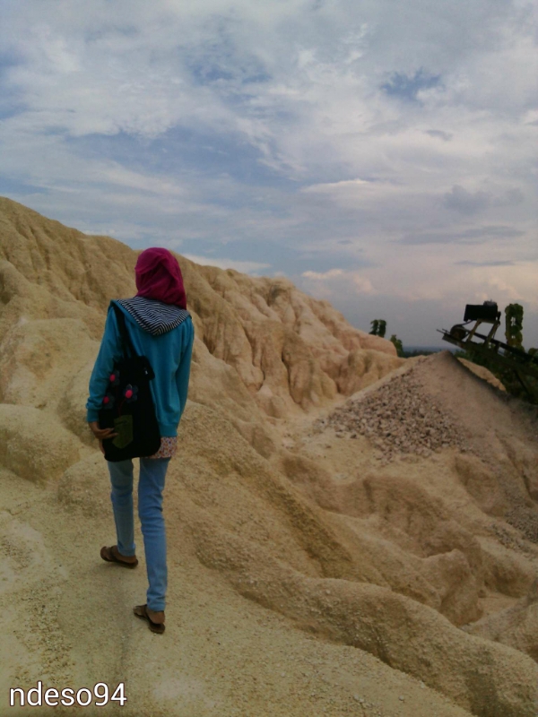 Ada jurang yang sekitar belasan meter nih, yang sudah habis batuan kapurnya. Nah, penampakan pasir kwarsa yag menumpuk mengeras ada di bawah :