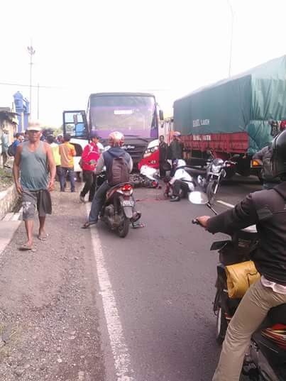 Korban tewas ada satu orang yaitu pengendara motor. Perkiraan menderira luka berat di kepala. Sepeda motor yang dikendarai korban tertabrak bus yang melawan arah, dilihat dari foto sepertinya manuver mendadak dan pengendara motor tidak sempat menghindar.