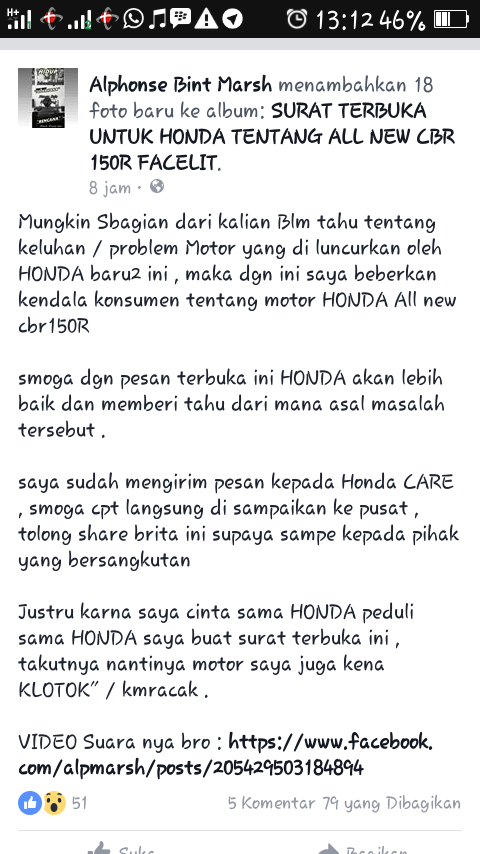 Dishare oleh akun facebook Alphonse bertajuk Surat Terbuka Untuk Honda Tentang All New CBR150R Facelift. Surat ini ditujukan kepada Honda, terkait problem dan keluhan terhadap motor CBR. Bagaimana surat terbukanya? Monggo bro ndess screenshoot langsung dari facebook serta beberapa foto yang turut dibagikan, beberapa keluhan dari pengguna CBR lainnya :
