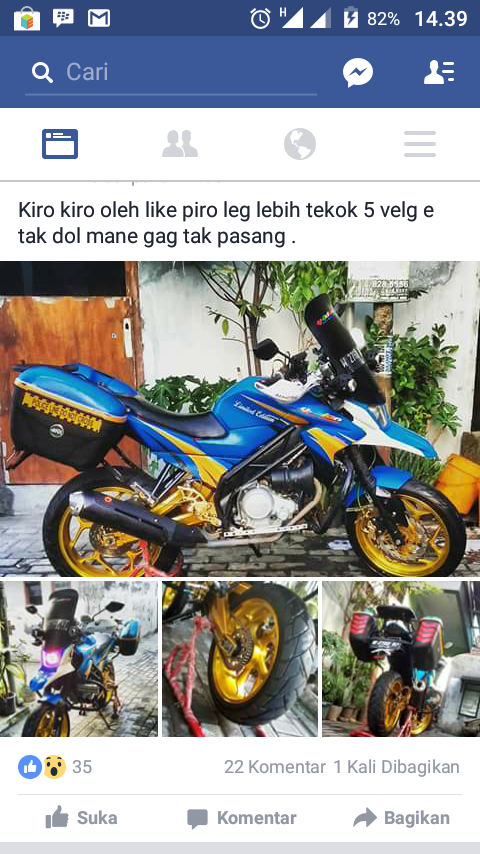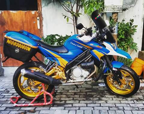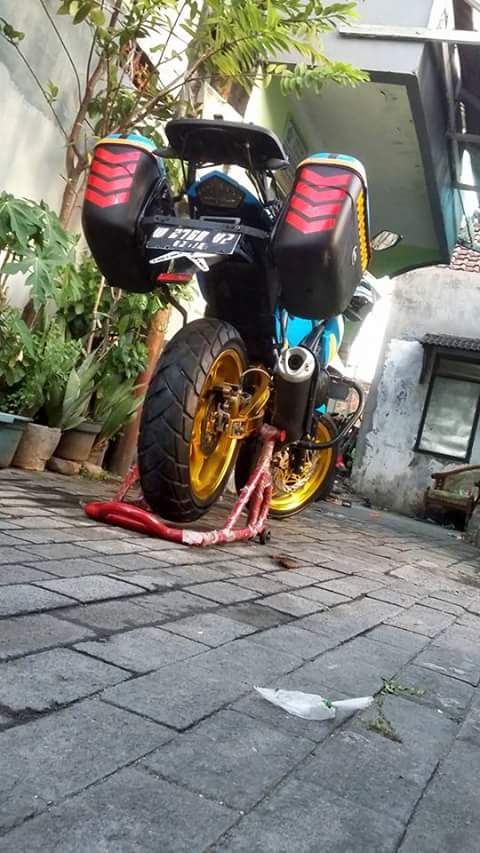 Brosis, di sebuah group facebook ada seorang netizen yang juga seorang pedagang online peninggi shock depan mengupload motornya yang telah dimodifikasi keren. Modifikasinya mengarah ke genre motor grand touring.