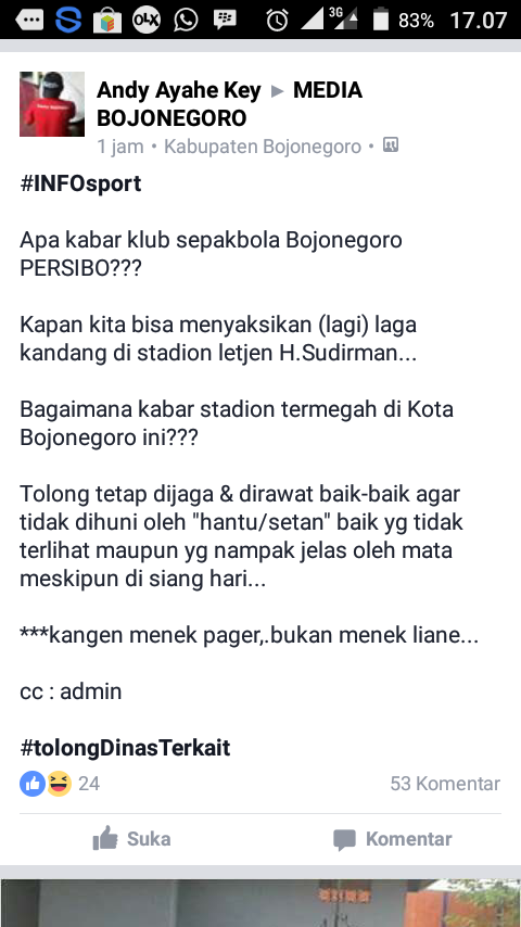 Brosis, di Bojonegoro ada stadion satu satunya yang megah dan dipakai dulunya sebagai kandang dalam pertandingan persibo Bojonegoro. Kini ketika kesebelasan Persibo sedang vakum, Stadion ini nyaris sunyi tanpa kegiatan. Yang ramai biasanya di area luar stadion. Nah, ada netizen yang menangkap adegan kuda kudaan nih di siang bolong.