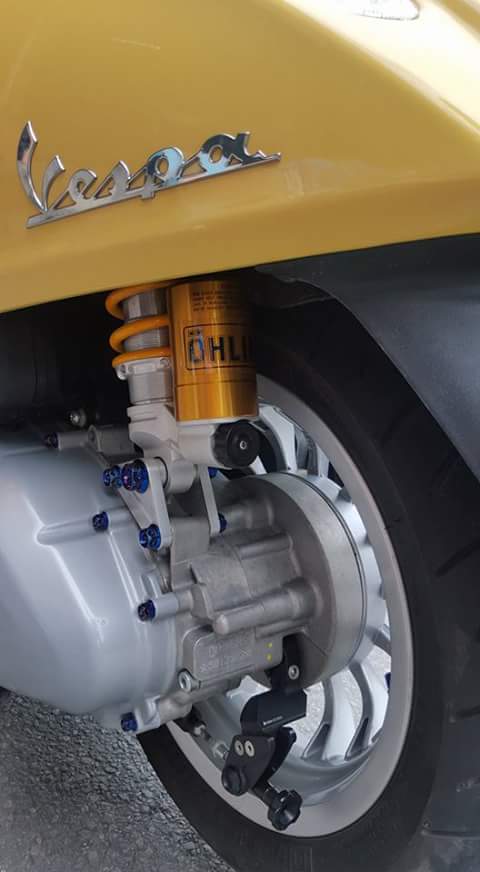 Dua merk branded yang nemplok di Vespa kuning ini adalah satu set alat pengereman merk Brembo, dengan handle asli brembo, cakram dan kaliper. Kemudian pada suspensi depan dan belakang nemplok shock merk Ohlins. Shock mahal ini nemplok di suspensi depan dan belakang. Wow… Bisa kehitung berapa harganya kalau dirupiahkan.