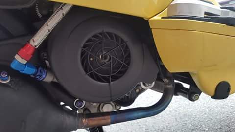 Modifikasi lainnua adalah tutup oli custom dengan saluran pernapasan oli. Tutup shock depan yang dibalut karbon kevlar, serta visor tambahan.