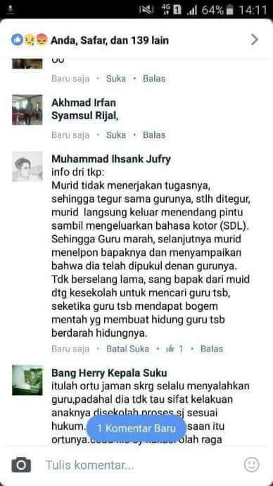 Padahal kelihatan sopan gitu ortunya, tapi kenapa ya lagaknya kayak preman pas memukul gurunya. Situ sehat pak? Apa mau niru guru Sidoarjo yang terpaksa dipenjara 3 bulan karena ortu oknum TNI yang lapor polisi? Didik sendiri sana, anak anda supaya pinter. Jangan sekolahin jika gurunya aja anda tempeleng.