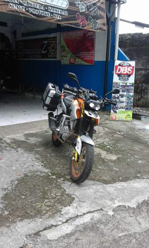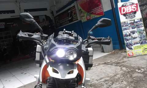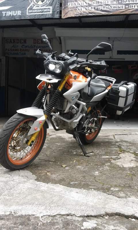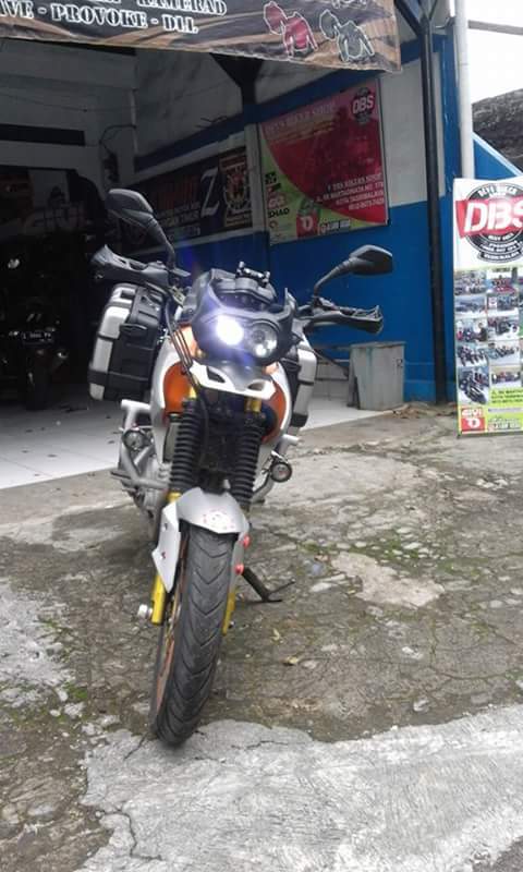 Tak hanya itu. Modifikasi lain adalah engine guard yang kuat, ditambah dua biji sidebox pannier. Shock ditinggikan depan belakang serta pemakaian velg jari jari besar, menambah kesan motor touring ala GS.