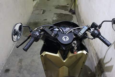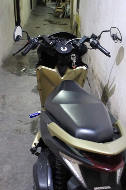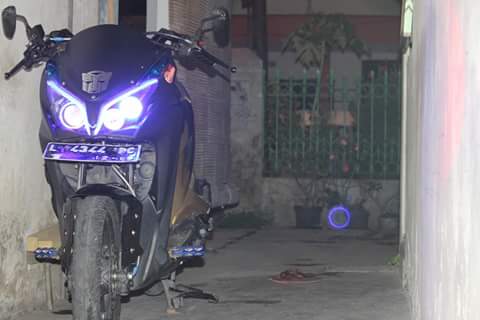 Dengan pemakaian visor Ninja yang gelap, tampilan sudah berubah. Tak lupa stang ditrondolin, diganti model stang jepit agar lebih sporty. Jadi kesannya big matic sport. Modif seperti ini biasanya terinspirasi PCX.