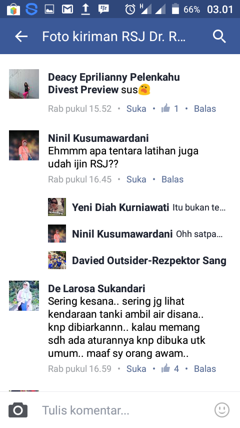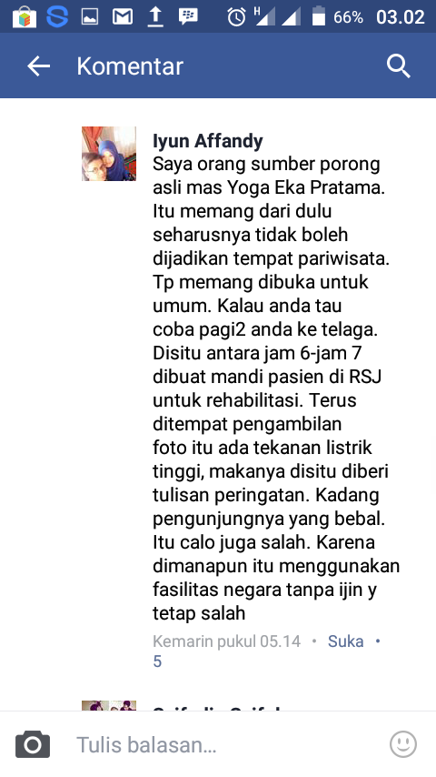 Langsung dari fanspage resmi RSJ bersangkutan, memberi pernyataan bahwa segala aktivitas tanpa ijin seperti foto apapun termasuk underwater, mandi, mengambil air, buang sampah adalah illegal!