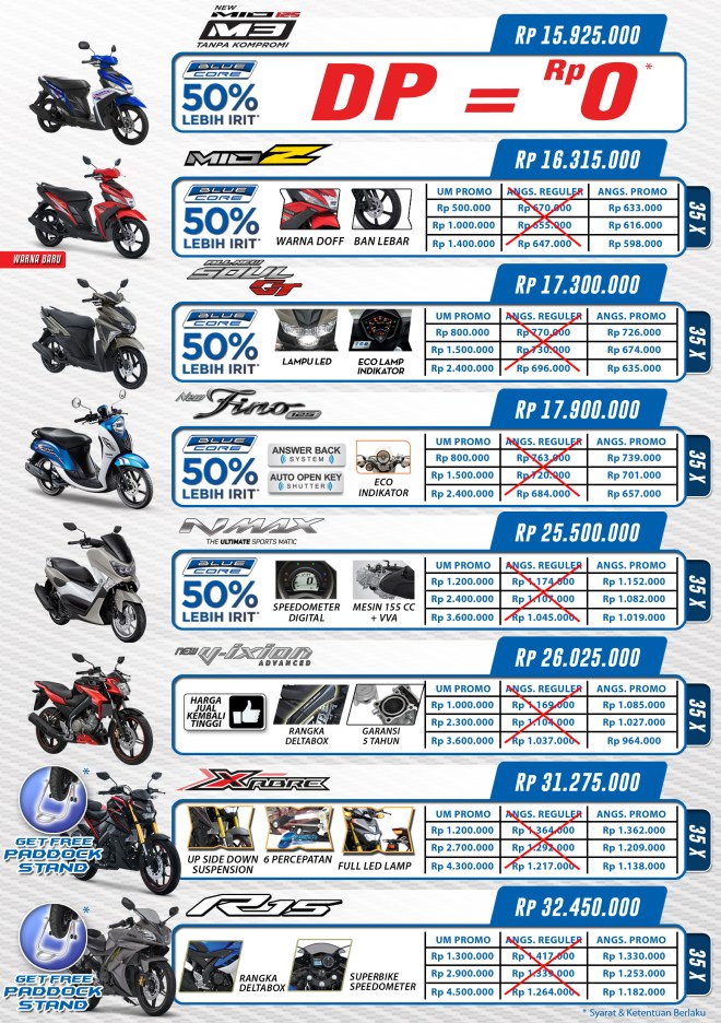 Program ini berlangsung dari tanggal 15 – 31 Oktober 2016 serta berlaku diseluruh dealer-dealer Yamaha di Jawa Timur (kecuali karesidenan Kediri dan karesidenan Madiun). Jadi Tunggu apalagi segera miliki Yamaha Mio M3 125cc Bluecore dan datangi dealer dealer terdekat untuk mendapatkan info detailnya. Yamaha Semakin Didepan.