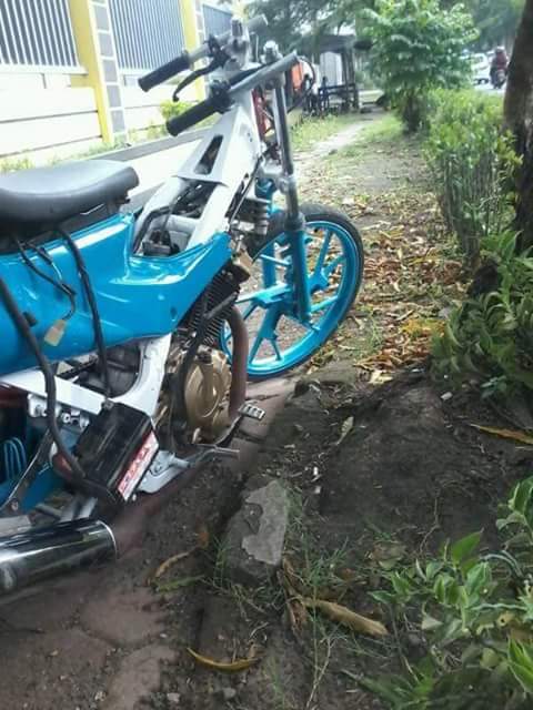 Yaps, sesuai judul. Satria FU warna biru, dengan modif trondol ala motor drag asal Mojokerto. Mengalami kecelakaan menabrak kabin truk Canter yang keluar gudang. Pengemudi motor selamat dengan luka parah serta kondisi motor yang masih utuh.